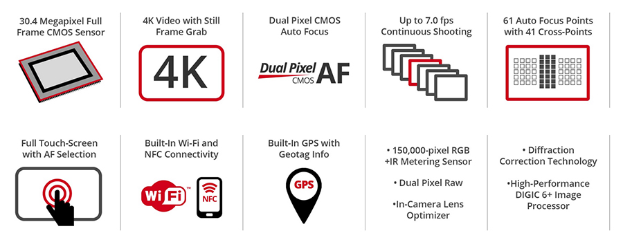 Tốc độ màn trập trải dài từ 1/8.000 giây đến 30 giây, tốc độ chụp liên tiếp 7fps (7frames/giây), chip xử lý hình ảnh DIGIC 6+, công nghệ lấy nét Superb Dual Pixel CMOS AF với 61 điểm lấy nét tự động giúp chiếc DSLR này "đeo bám" chủ thể tốt hơn và ghi điểm với các nhiếp ảnh gia chuyên về thể thao, hành động.