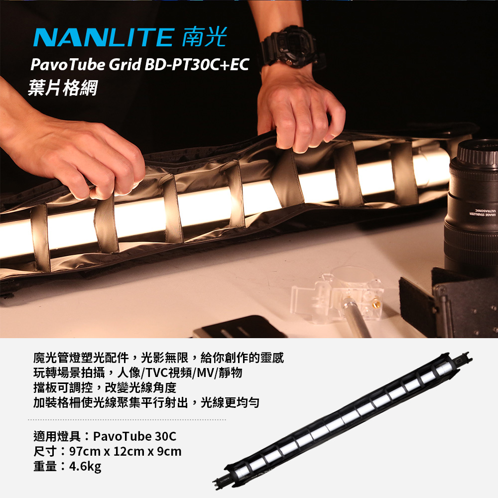 Bao gồm: Đèn Nanlite PavoTube II 30X, bảng kẹp giữ đèn + giá đỡ, nguồn + dây, 2 ốc + 2 dây cột đèn, chân